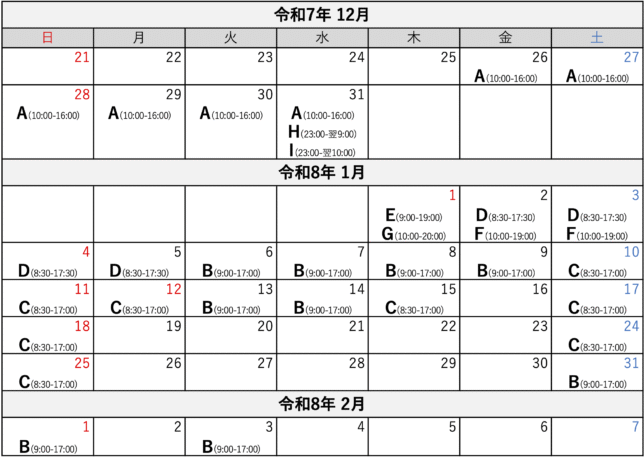 下記の日程表にアルファベットが記載されている日の中から勤務可能な日時を選択して下さい。勤務時間は日によって変動いたしますので、必ずご確認をお願い致します。複数のアルファベットが記載されている日は、勤務可能なものを全てご記入ください。